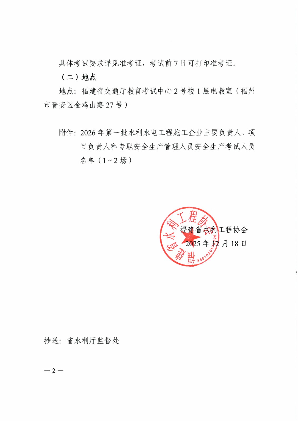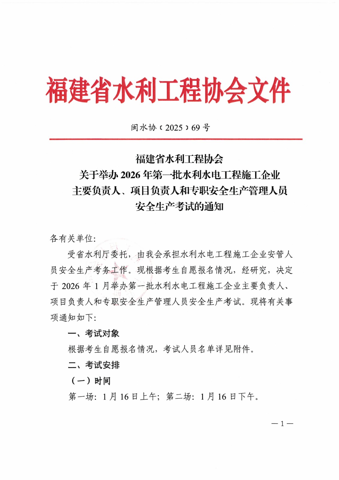 福建省水利工程协会关于举办2026年第一批水利水电工程施工企业主要负责人、项目负责人和专职安全生产管理人员安全生产考试的通知