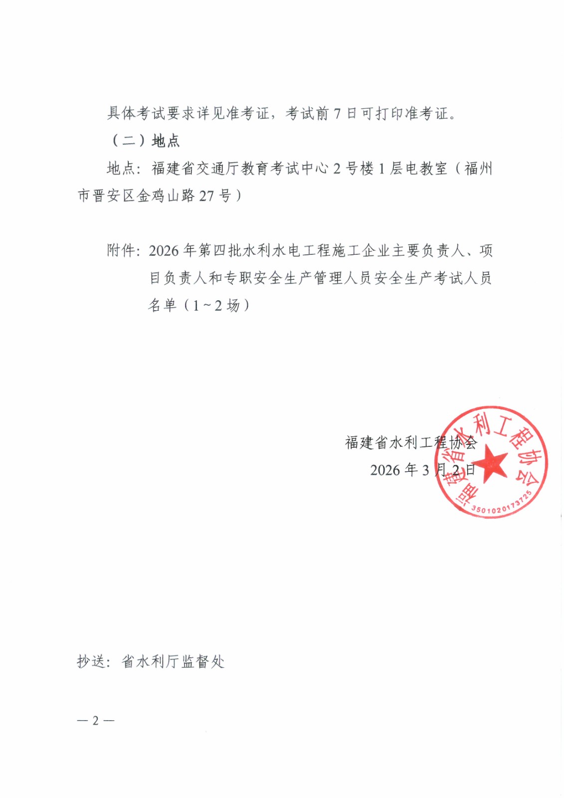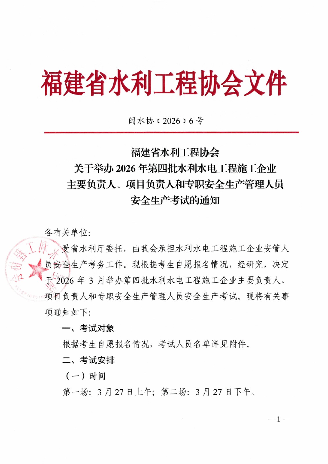 福建省水利工程协会关于举办2026年第四批水利水电工程施工企业主要负责人、项目负责人和专职安全生产管理人员安全生产考试的通知